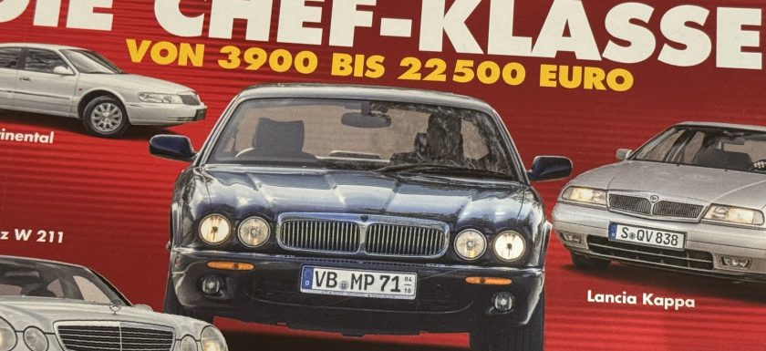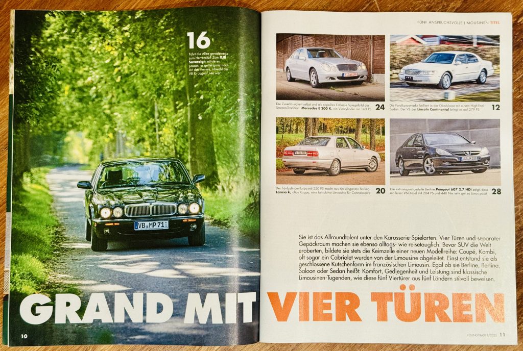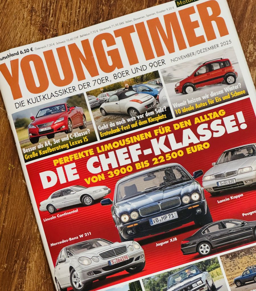 Es ist immer wieder nett, wenn einem das eigene, langjährige Modell auf der Titelseite der Youngtimer-Zeitschrift begegnet. So ging es mir einmal mehr mit der aktuellen Youngtimer-Ausgabe von November/ Dezember 2025 (die sich hier online bestellen lässt). „Die Chef-Klasse“ steht da, und mittig zwischen Lancia, Lincoln, Mercedes und Peugeot ist der Jaguar x308 in Szene gesetzt.
