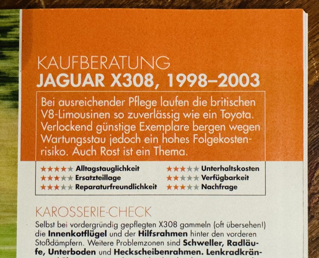 Die Kaufberatung gibt insgesamt gut wieder, was ich auch auf meinem Block anhand vieler verschiedene Beiträge immer wieder zum Ausdruck bringen möchte. Der Jaguar X308 ist ein Youngtimer mit durchaus robuster und zuverlässiger Technik, solange Wartungsstau und Rost keine Rolle spielen.