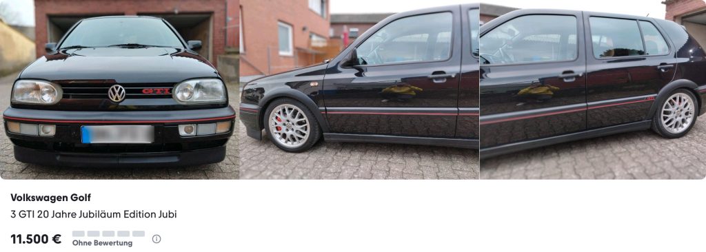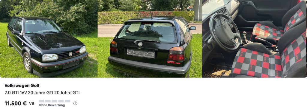 Für den gleichen Preis – 11.500 Euro – wird in Jülich bei Aachen ein 20 Jahre GTI aus privater Hand angeboten, bei dem laut Inserat Schweißarbeiten und Rostentfernung an Unterboden und Dom erfolgt sind. Er kommt außerdem mit KW-Fahrwerk und Spurverbreiterung, steht diesbezüglich also nicht mehr ganz original da…