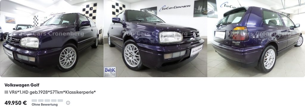 In Wuppertal findet sich zum Beispiel dieser Golf VR6 aus erster Hand einer Dame Jahrgang 1928 mit nur 57.000 km Laufleistung. Solche Autos sind heute extrem rar geworden. Das Automatikgetriebe wäre für mich subjektiv eher Nachteil als Vorteil, aber nun gut. Dafür steht ihm die Kultfarbe Farbe Dark Violett Perleffekt aus meiner Sicht verdammt gut. Den Inseratstitel „Klassikerperle“ kann ich nachvollziehen – aber der Preis von 49.950 Euro hinterlässt Eindruck bei mir.