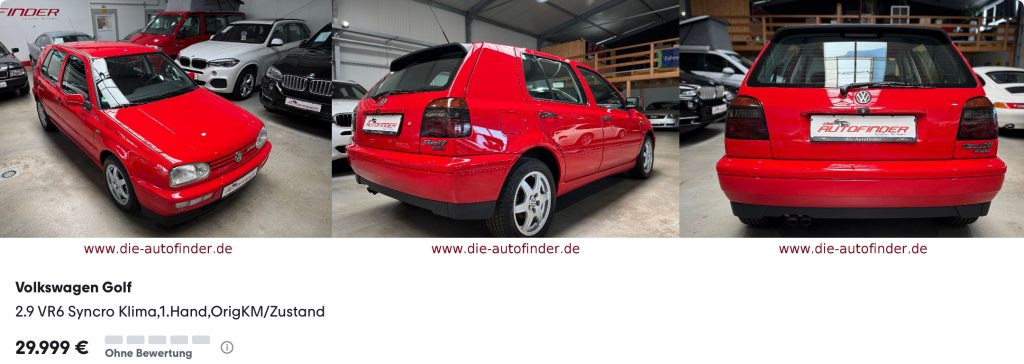 In der Nähe von Dresden steht ein weiteres, reizvolles Exemplar: Golf VR6, erste Hand, laut Inserat auch erst 72.000 km, Schaltgetriebe, tornadorot. Beeindruckend 😁 Es handelt sich hierbei sogar um einen VR6 syncro, der damit nicht nur den Allradantrieb hat, sondern auch den VR6-Motor mit 2,9 Litern und 190 PS (statt 2,7 Litern mit 174 PS im VR6 ohne syncro). Das ist vom Inserat her schon nahe am perfekten Golf III – allerdings überschreiten auch die 30.000 Euro mein Budget für einen Dreier-Golf…