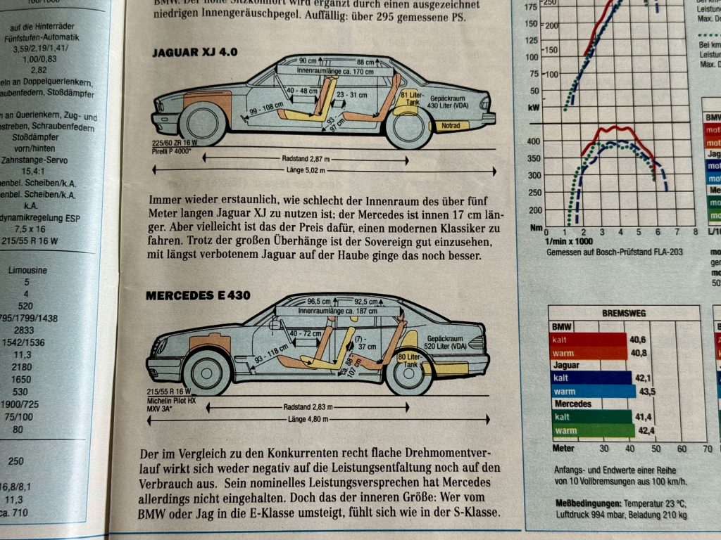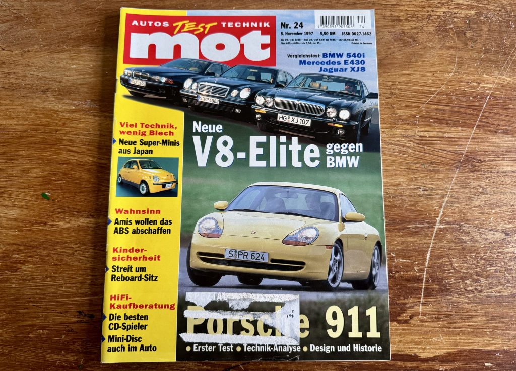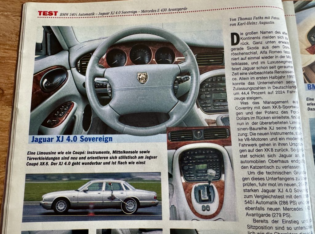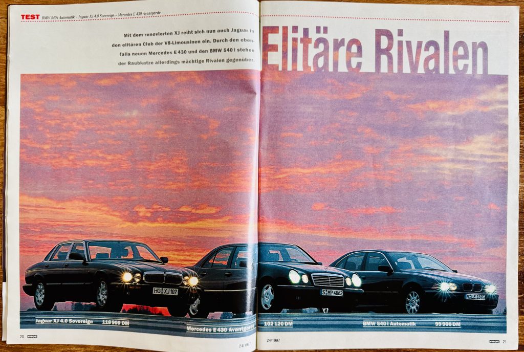 Das waren noch Zeiten 1997: Der Jaguar X308 war frisch erschienen und traf mit BMW 540i und Mercedes E430 auf zwei deutsche Konkurrenten, die ebenfalls neu auf dem Markt erschienen waren. (Erwähnenswert ist auch, dass es 1997 die Zeitschrift mot noch gab, die ich sehr sympathisch fand. Sie wurde 1960 gegründet und kämpfte in den letzten Jahren mit stark fallenden Auflagen, bevor sie dann 2006 final eingestellt wurde.)