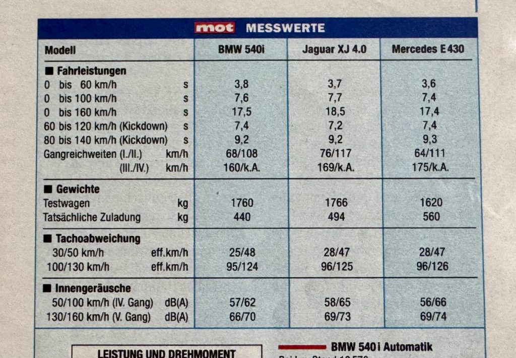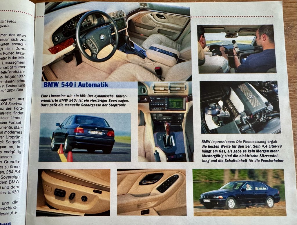 Die Begeisterung der mot-Tester insbesondere für das Aggregat des BMW 540i zieht sich wie ein roter Faden durch den Testbericht. „Das Triebwerk treibt einen rein subjektiv so vehement und dabei kultiviert nach vorn, dass wirklich M5-Feeling aufkommt. … Während die Gangwechsel im Standardbetrieb unmerklich ablaufen, drückt es die Passagiere beim Kickdown kräftig in die Sitze. Das ist zwar sportlich, fast aber schon aggressiv und keineswegs elegant“ (mot 24/1997, S. 26).