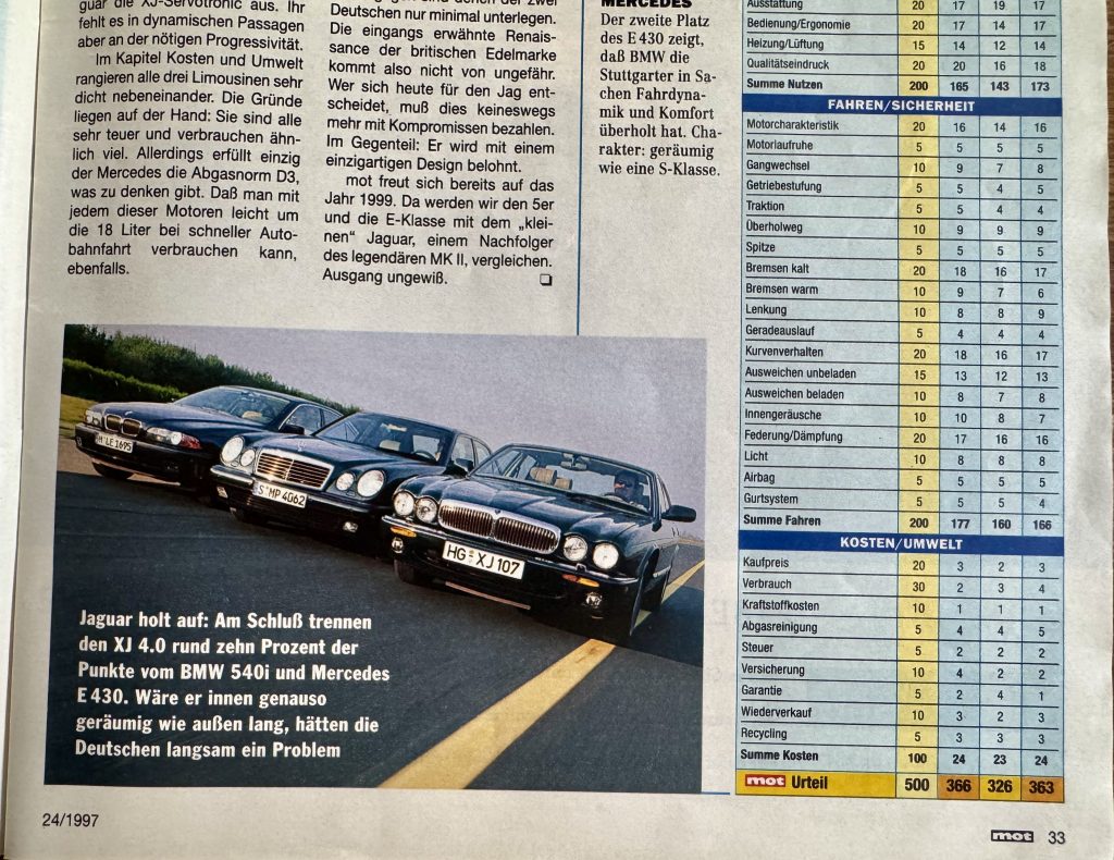 Mir ist am Wochenende die mot-Ausgabe 24 des Jahres 1997 in die Hände gefallen, deren Titelbild eben unter anderem der Jaguar X308 ziert. Der Anlass: „Mit dem renovierten XJ reiht sich nun auch Jaguar in den elitären Club der V8-Limousinen ein. Durch den ebenfalls neuen Mercedes E430 und den BMW 540i stehen der Raubkatze allerdings mächtige Rivalen gegenüber“ (mot 24/1997, S. 20).