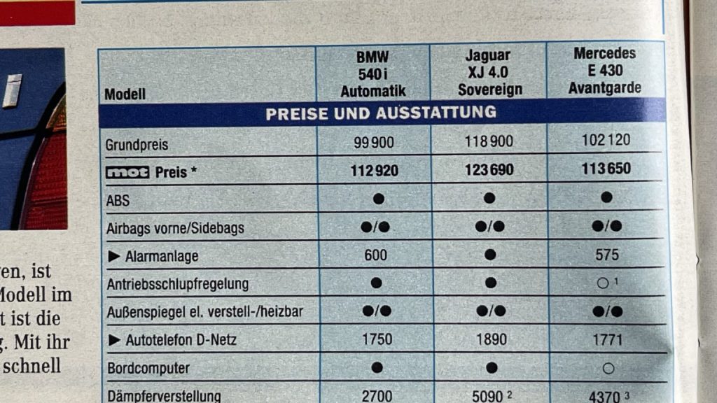 Das teuerste Modell in diesem Trio ist eindeutig der Jaguar, wobei er auch in der Premium-Variante „Sovereign“ zum Vergleich antrat. So ausgestattet kostete er stolze 19.000 DM mehr als der BMW 540i, der auf den Grundpreis bezogen am günstigsten war. Dafür glänzt der Sovereign jedoch auch mit der umfangreichsten Serienausstattung. Das ist der Grund, warum die Preisdifferenz mit dem sogenannten „mot-Preis“ etwas abschmilzt: Hier kalkuliert die Redaktion die aus ihrer Sicht wichtigsten Sonderausstattungen mit ein, von denen der XJ8 einige serienmäßig an Bord hatte.
