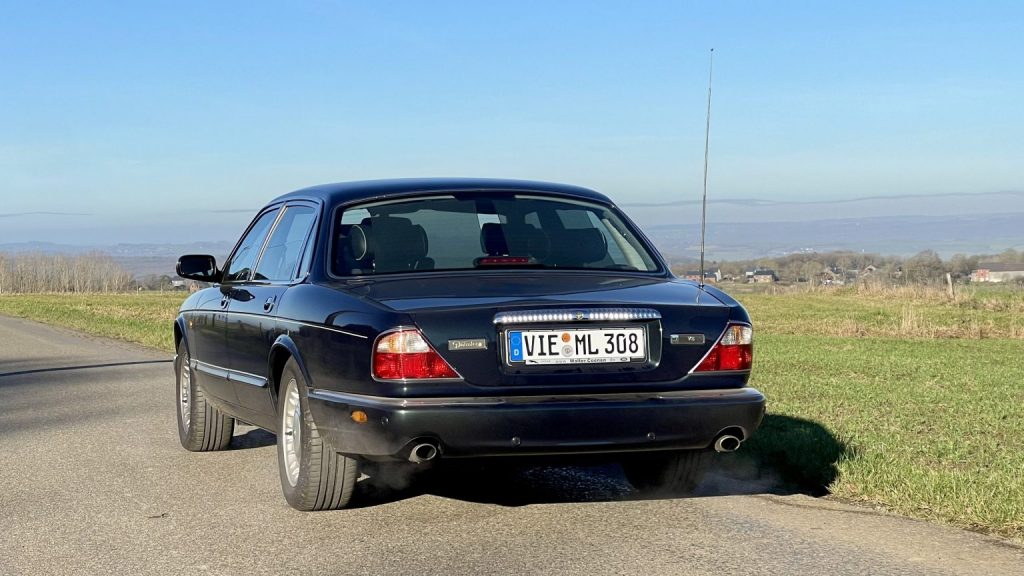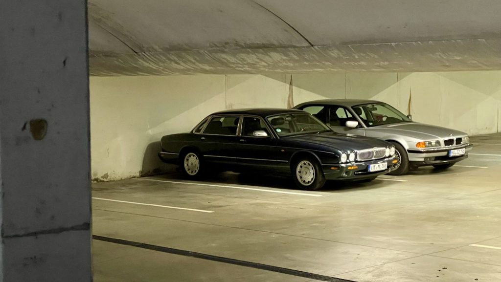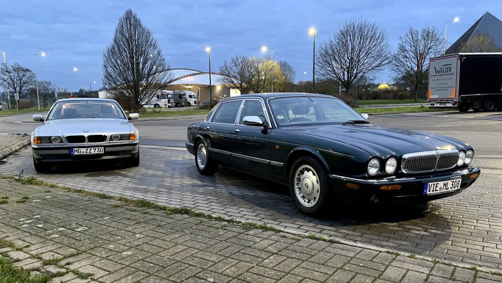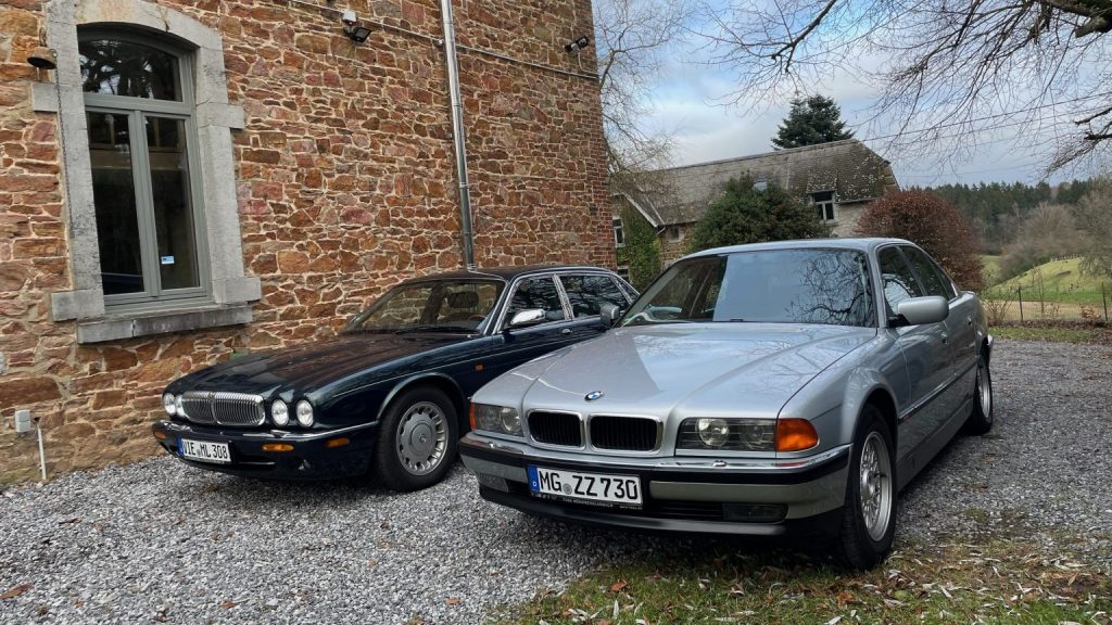 Wir sind unterwegs mit einem BMW 730i von 1994 – er ist einer der allerersten E38 – und meinem Jaguar Daimler V8 aus dem Jahr 2000. Die beiden waren damals übrigens direkte Wettbewerber. Der E38 wurde von 1994 bis 2001 produziert, der X300/X308 von 1994 bis 2002. Sowohl der 730i als auch der X308 sind mit V8-Motoren ausgestattet. Last not least, beide sind gemeinhin als ästhetisch besonders gelungene Luxuslimousinen anerkannt.