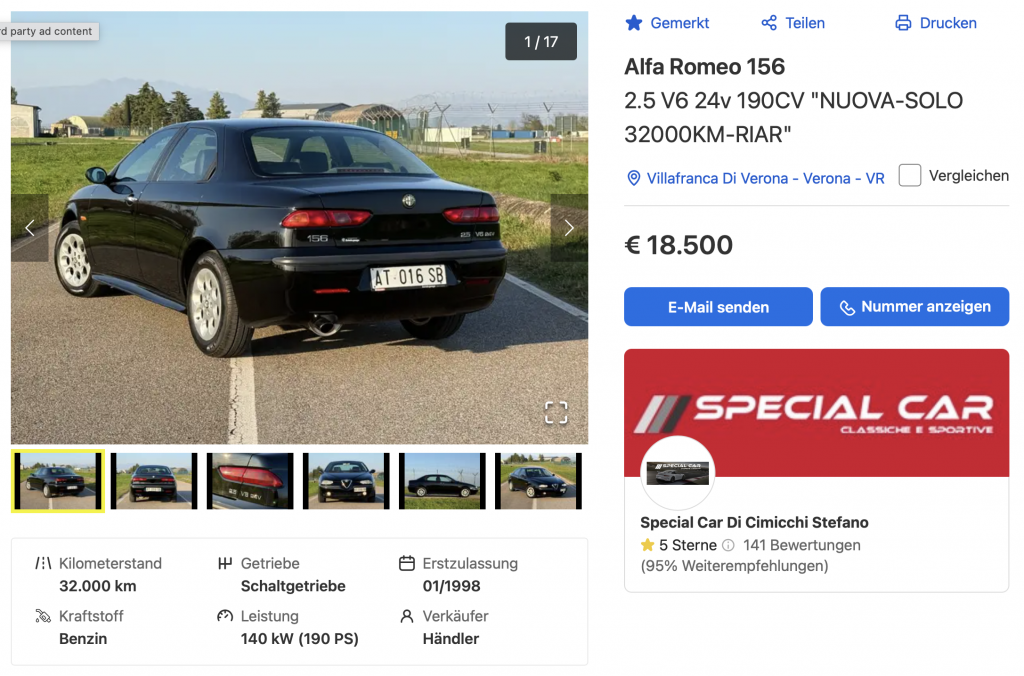 Und auch hier möchte sich der HĂ€ndler den Ausnahmezustand des Fahrzeugs gerne bezahlen lassen. 18.500 Euro sind fĂŒr einen Alfa Rome 156 2.5 V6 eine Hausnummer. Auch hier gilt ĂŒber den vorherigen Inseraten, dass es einen Liebhaber braucht, der einen solches Modell im bestmöglichen Zustand sucht und dafĂŒr auch einige Tausend Euro mehr zu bezahlen bereit ist. Hier ist der Link zum Inserat (solange es noch online ist).