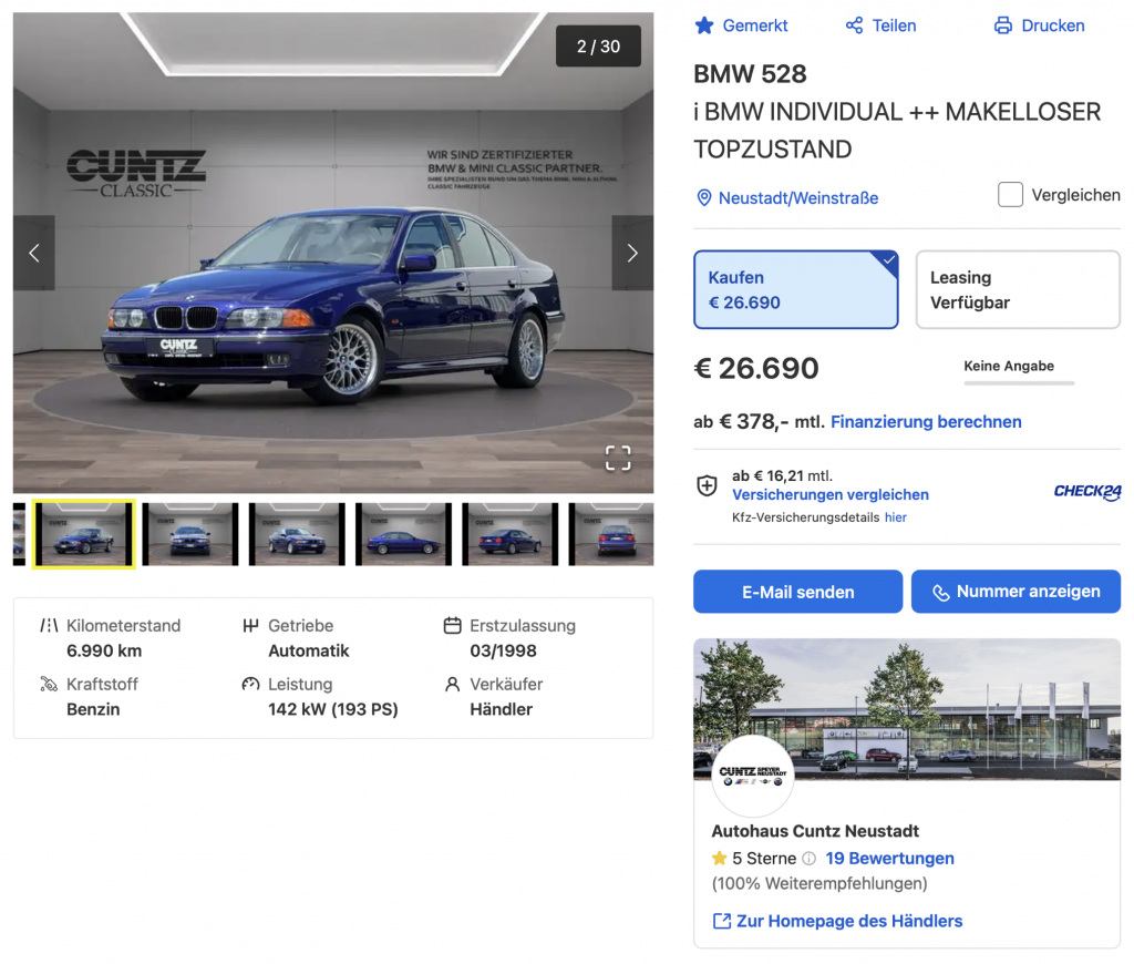 Auch wenn der BMW E39 kein besonders seltener Youngtimer ist, bekommt man mit diesem 528i ein vermutlich ziemlich einzigartiges Angebot, das aus Zustand, Laufleistung und Individualausstattung resultiert. Es war nicht anders zu erwarten, dass sich das auch im Preis widerspiegelt. Mit knapp 27.000 Euro ist das auch der mit Abstand teuerste 528i, der aktuell angeboten wird. Reizvoll finde ich das Angebot nichtsdestotrotz! đ Solange es online ist, findet sich hier der Link zum Inserat.