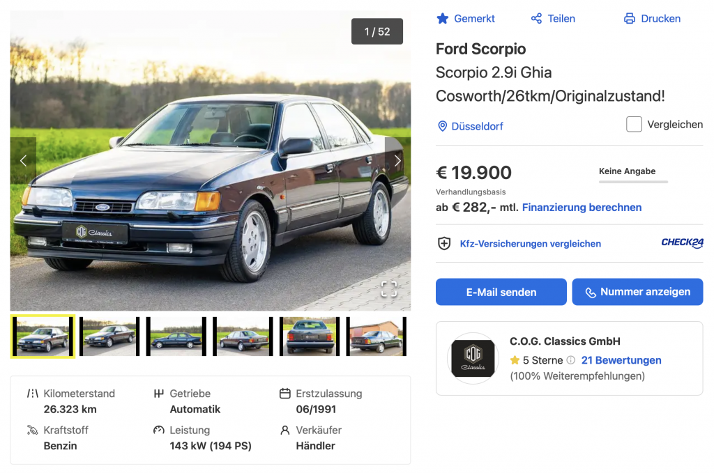 Umso bemerkenswerter ist dieses Angebot: Hier wird das Topmodell â ein Scorpio 2.9i Ghia Cosworth mit 195 PS â und einer Laufleistung von nur 26.000 Kilometern angeboten! Diese Seltenheit hat ihren Preis: 19.900 Euro sind fĂŒr einen Ford Scorpio, dessen Preise ansonsten im Bereich weniger Tausend Euro liegen, selbstbewusst.