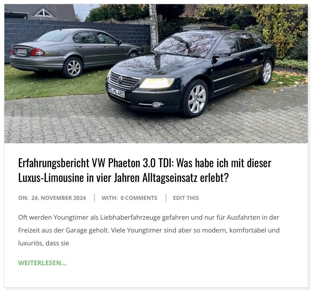 Man kann einen Youngtimer aber auch weniger spektakulär als Familienauto einsetzen und sich dabei am Luxus der 2000er Jahre erfreuen. Das erläutert zum Beispiel Markus in diesem Erfahrungsbericht nach vier Jahren mit einem VW Phaeton als Familienauto im täglichen Einsatz: